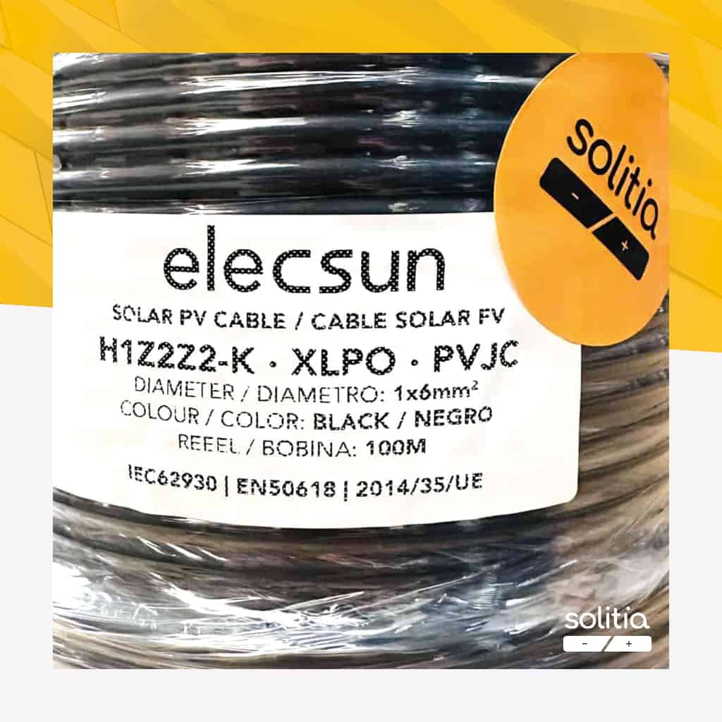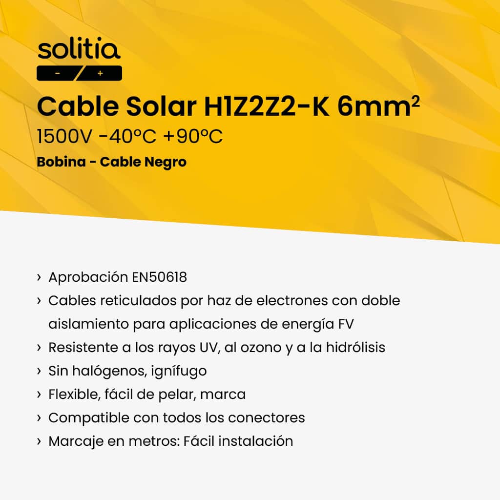 100 meters of 6mm2, 1500V black solar cable specialized for photovoltaic installations, flame-retardant and halogen-free. Maximum driver temp.: 120º Maximum short-circuit temp.: 250º (maximum 5s.) Temperature range: -40º +90º Reference standards: IEC 60332-1-2, EN 50618 and IEC 62930 Compatible with all connectors.