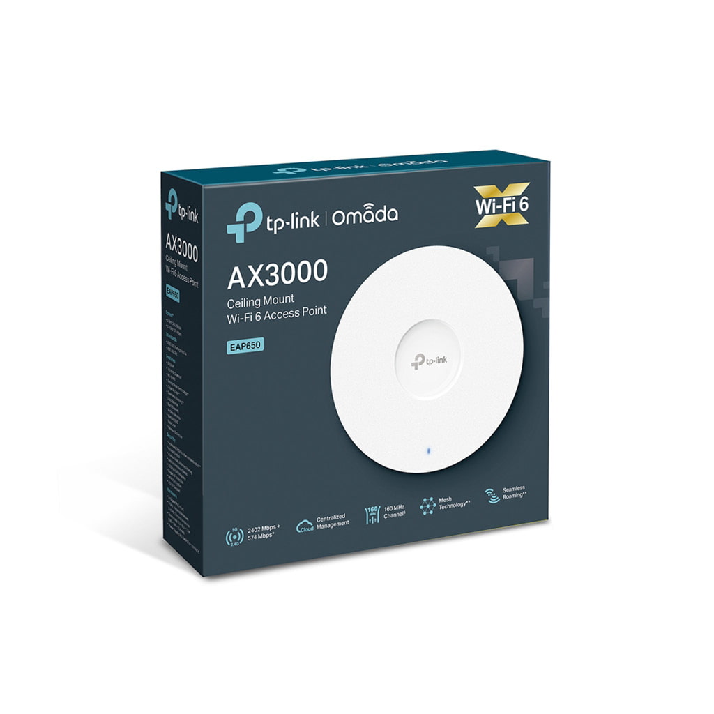 EAP650 Ceiling Mount Wi-Fi 6 Access Point AX3000 Ultra-fast Wi-Fi 6E speeds. High-efficiency WiFi 6. Centralized cloud management. 160 MHz channel. Continuous roaming. Omada Mesh. Powered by PoE+. Ultra-thin design.