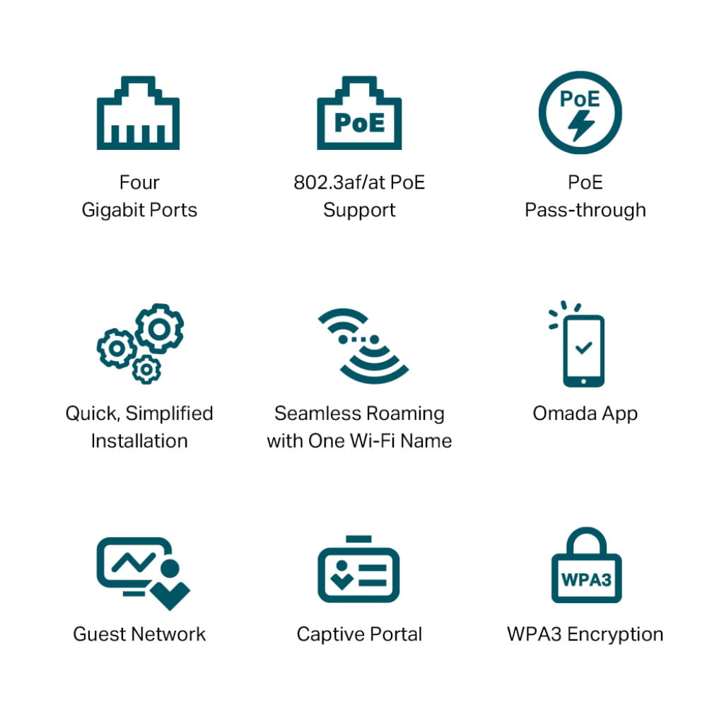 EAP655-Wall AX3000 Wall-Mount Wi-Fi 6 Access Point Ultra-fast Wi-Fi 6 speed. High Efficiency Networks. Wi-Fi coverage in every room. Gigabit Ethernet port. Centralized Management. Secure guest network. PoE support. Easy installation.