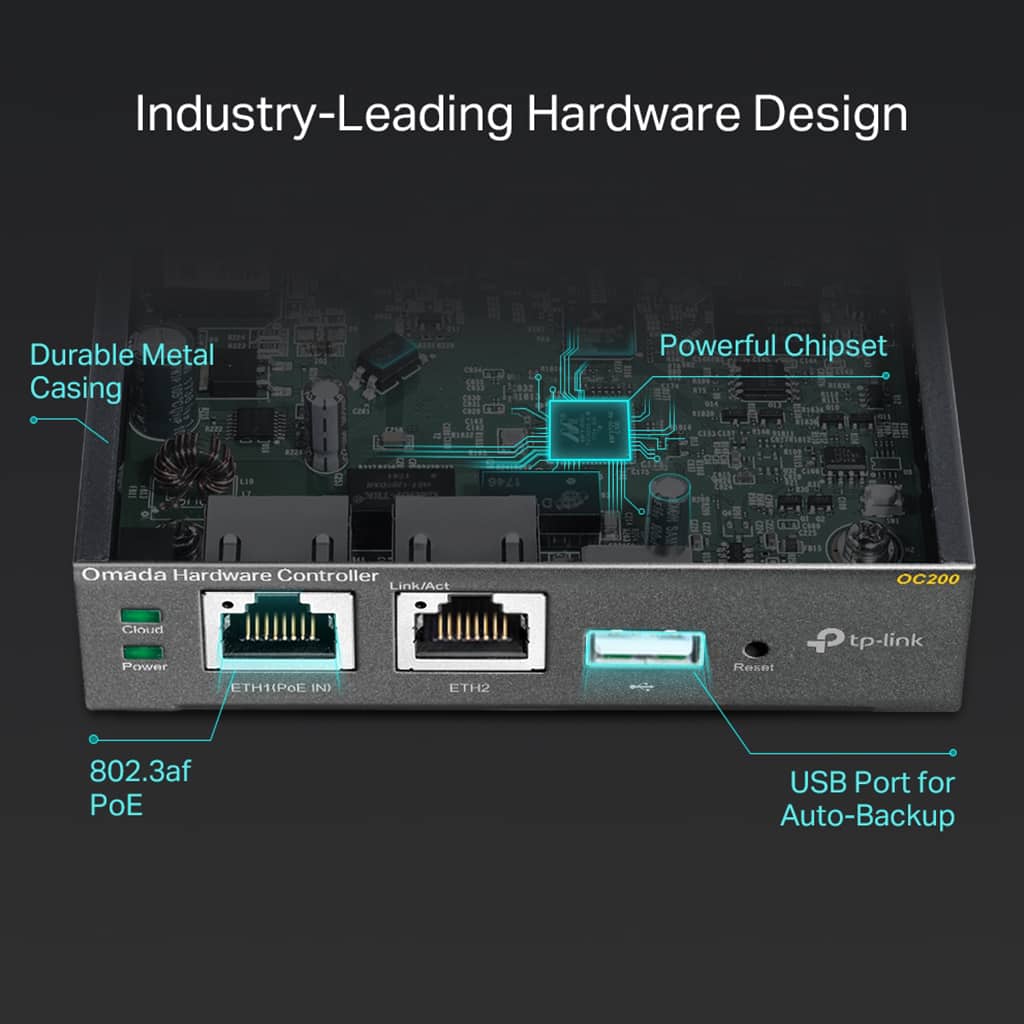 Omada OC200 Hardware Controller Centralized administration of up to 100 access points. Free access to the cloud. On-site management. Industry-leading hardware design. Flexible power supply. Easy and smart network monitoring. Real-time network topology. Easier network maintenance.