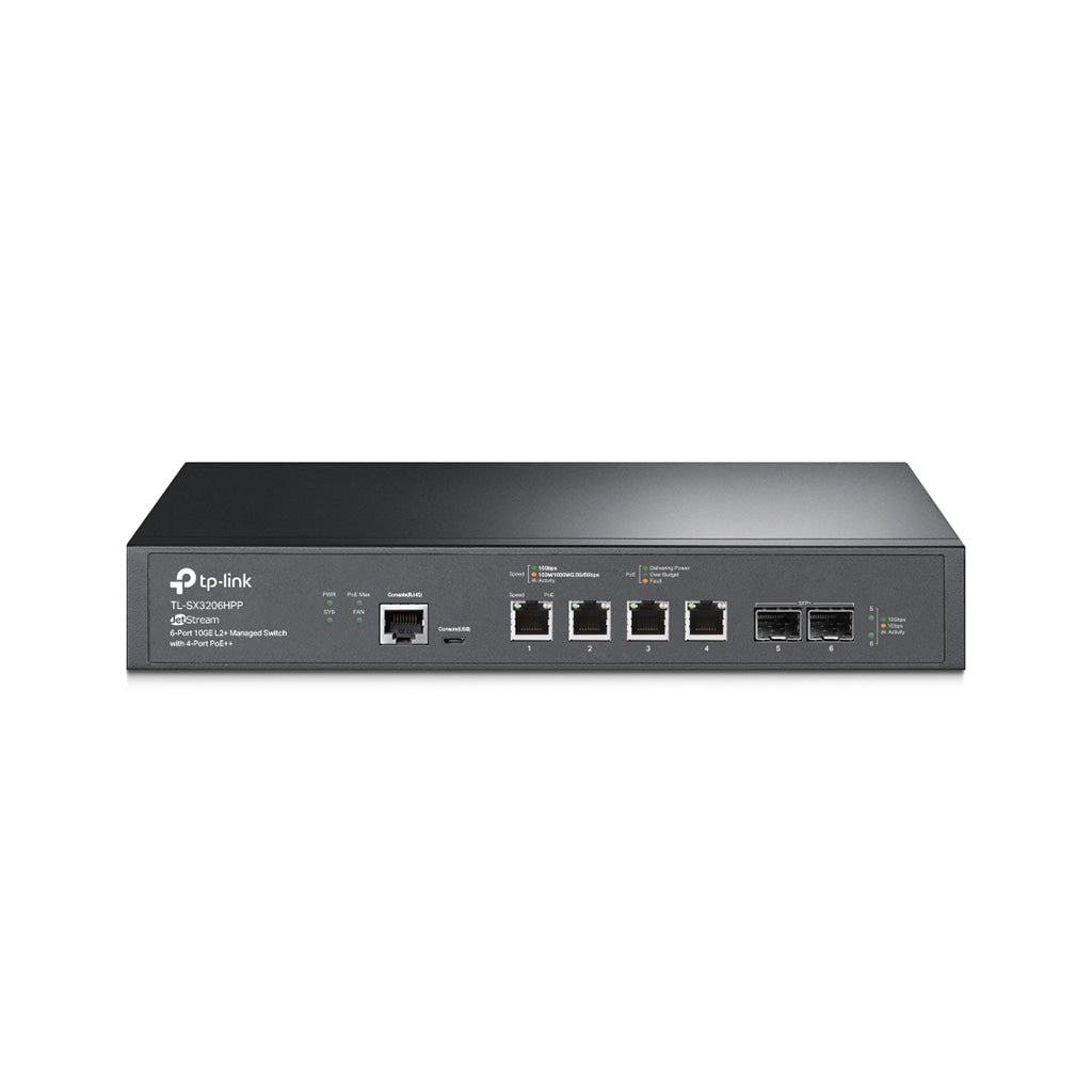 TL-SX3206HPP 6-Port 10GE L2+ JetStream Managed Switch with 4 PoE++ Ports Full 10G Lightning-Fast connection. PoE++ output with 200W power budget. Abundant L2 and L2+ functions. Solid security strategies. Static routing. Centralized cloud management. Independent administration.