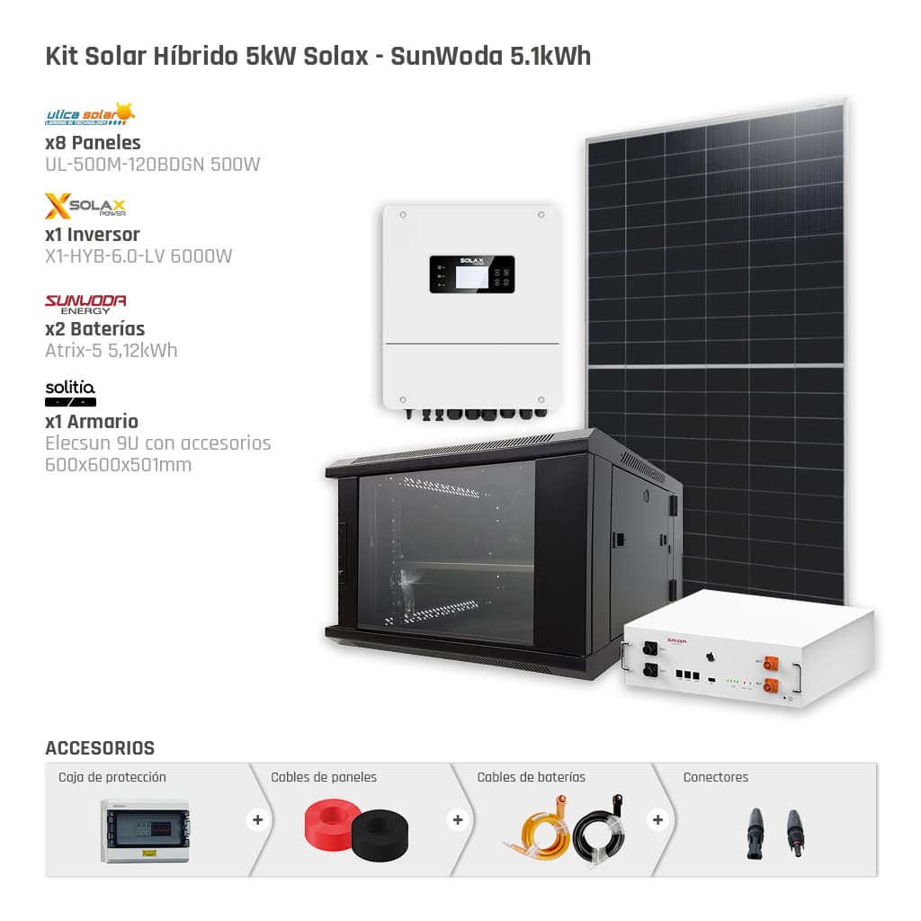 Descubre la independencia energética con el Kit Solar Híbrido 5kW Solax - SunWoda 5.1kWh de Solitia, la solución integral perfecta para hogares que buscan máxima eficiencia y autonomía energética. Este sistema avanzado combina generación solar y almacenamiento inteligente para garantizar suministro eléctrico las 24 horas del día.