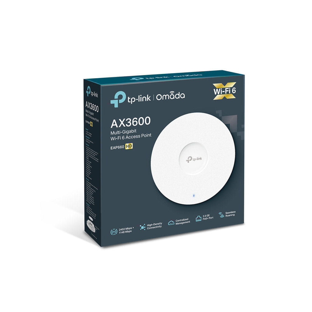 EAP660 HD Punto de acceso Wi-Fi 6 de montaje en techo AX3600 Velocidades Ultrarrápidas de Wi-Fi 6E. Redes de Alta Eficiencia. Integración total con Omada. Gestión Centralizada. Puerto Ethernet 2.5G. Roaming sin cortes. Compatibilidad con PoE+. Red de Invitados Segura.