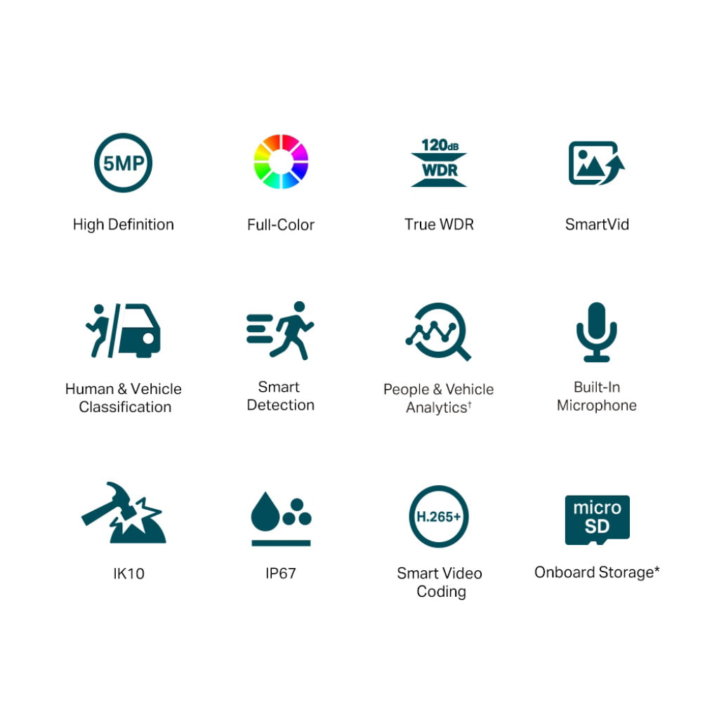 VIGI C250 Cámara IP VIGI tipo dome Full Color de 5MP Súper alta definición de 5 MP. 24 horas a todo color. Clasificación de humanos y vehículos. Detección inteligente. Análisis de personas y vehículos. Micrófono incorporado. IK10 a prueba de vandalismo y resistente al agua IP67. H.265+. Mejora de video inteligente. PoE/12 V CC. Administración y almacenamiento flexibles.