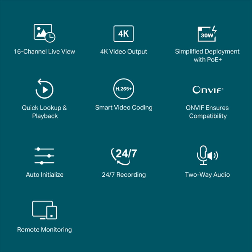 Salida de vídeo HDMI 4K y capacidad de descodificación de 16MP. 90 W PoE Budget. Reproducción simultánea de 16 canales. H.265+. ONVIF garantiza la compatibilidad. Inicialización automática para una configuración rápida. Grabación continua 24/7. Audio bidireccional. Supervisión remota.